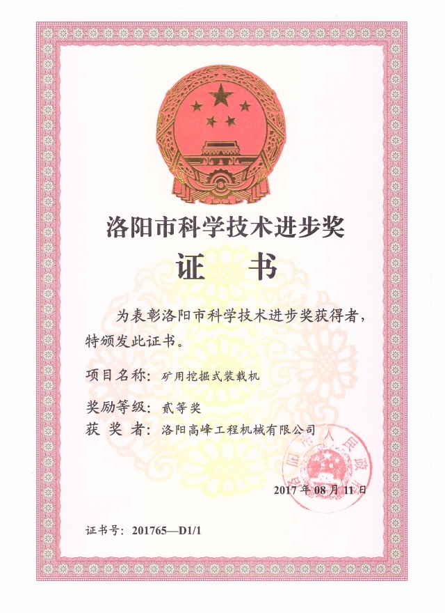 洛陽市科學進步獎證書